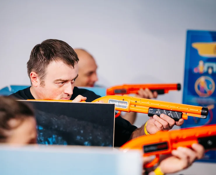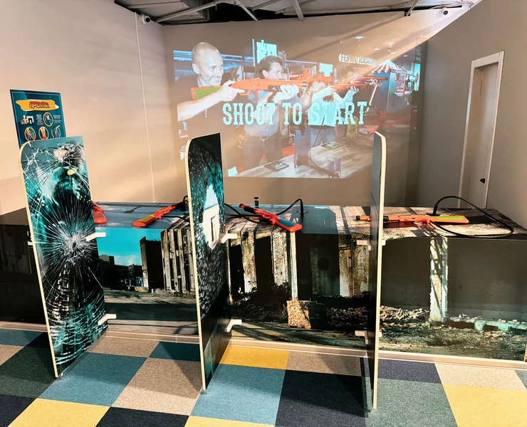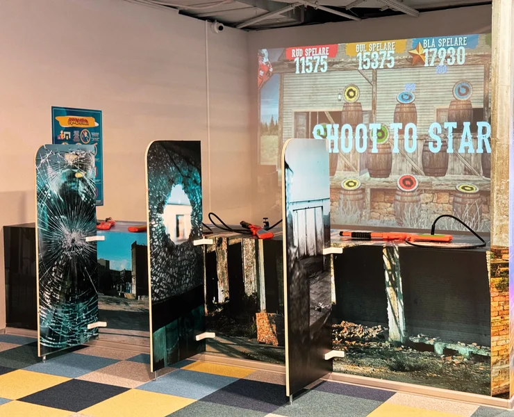Interaktīvā šautuve sastāv no četriem rotaļu ieročiem,kas ļauj šo spēli izmantot kopā ar draugiem. Šautves pamatprincips ir trāpīt pa krāsu aplīšiem ar Tevis izvēlēto pistoli pēc iespējas vairāk. Mērķi strauji mainās,tāpēc esi vērīgs,kuru krāsu esi izvēlējies Tu!